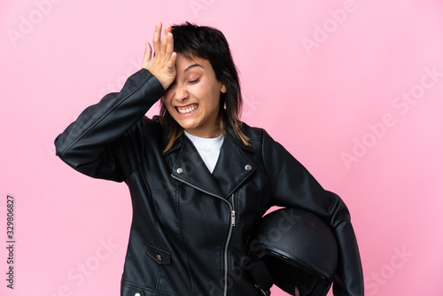 Young Uruguayan woman holding a motorcycle helmet over isolated pink background having doubts with confuse face expression