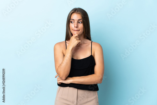Young Uruguayan woman isolated on blue background having doubts and thinking