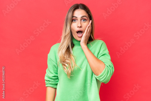 Young Uruguayan woman isolated on red background with surprise and shocked facial expression