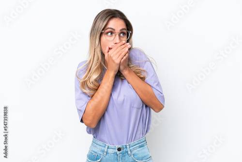 Young Uruguayan woman isolated on white background covering mouth and looking to the side
