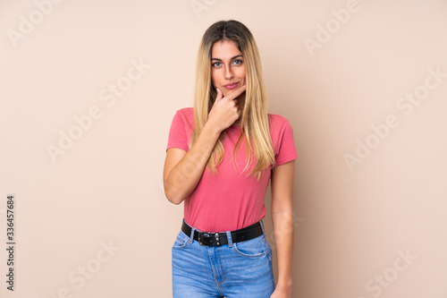 Young Uruguayan woman over isolated background thinking
