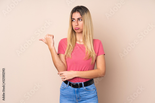 Young Uruguayan woman over isolated background unhappy and pointing to the side