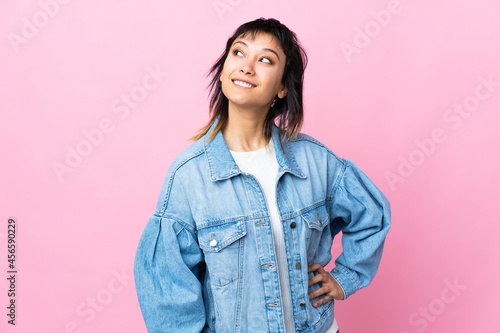Young Uruguayan woman over isolated pink background thinking an idea while looking up