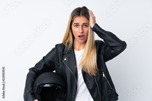 Young Uruguayan woman with a motorcycle helmet over isolated white background with surprise facial expression