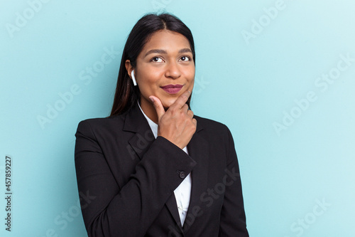 Young Venezuelan business woman isolated on blue background looking sideways with doubtful and skeptical expression.