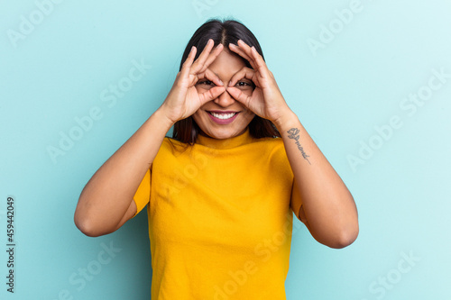 Young Venezuelan woman isolated on blue background excited keeping ok gesture on eye.