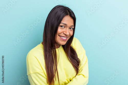 Young Venezuelan woman isolated on blue background laughing and having fun.