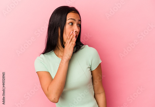Young Venezuelan woman isolated on pink background being shocked because of something she has seen.
