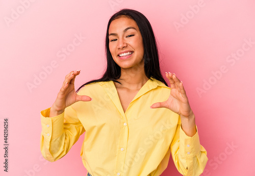 Young Venezuelan woman isolated on pink background holding something with palms, offering to camera.