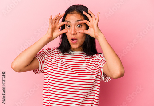 Young Venezuelan woman isolated on pink background keeping eyes opened to find a success opportunity.