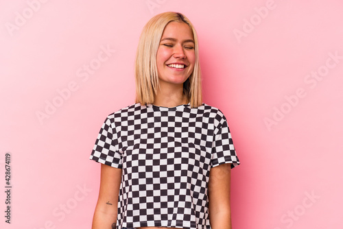 Young venezuelan woman isolated on pink background laughs and closes eyes, feels relaxed and happy.