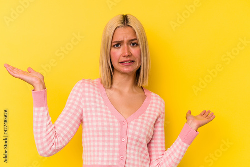 Young venezuelan woman isolated on yellow background confused and doubtful shrugging shoulders to hold a copy space.