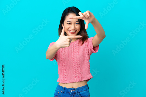 Young Vietnamese woman isolated on blue background focusing face. Framing symbol