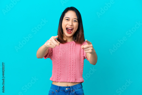 Young Vietnamese woman isolated on blue background surprised and pointing front