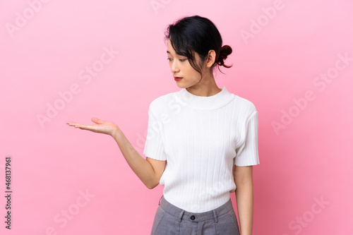 Young Vietnamese woman isolated on pink background holding copyspace with doubts