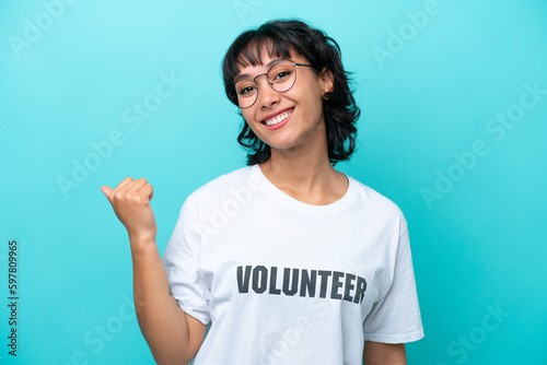 Young volunteer Argentinian woman isolated on blue background pointing to the side to present a product