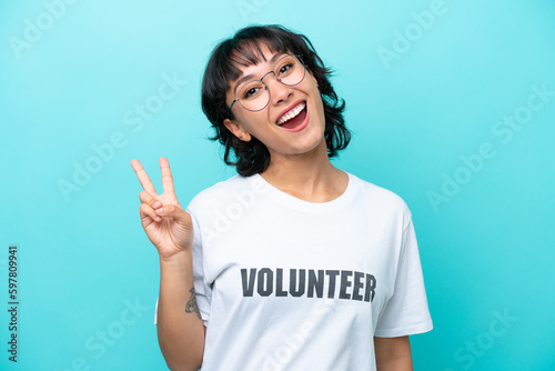 Young volunteer Argentinian woman isolated on blue background smiling and showing victory sign