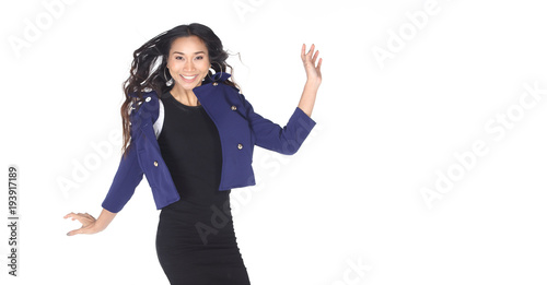 Young White Asian woman fashion make up showing empty copy space on the hand palm, portrait jean jacket short dress black hair, studio lighting white background isolated, concept buy this