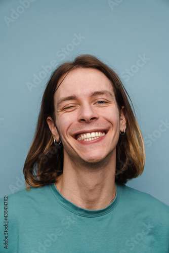Young white man wearing t-shirt smiling and winking at camera
