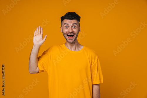 Young white unshaven man wearing t-shirt laughing and raising hand
