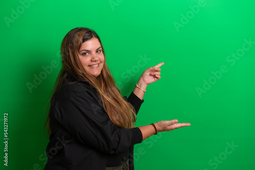 Young woman, posing and showing with hands, on Green Background