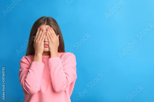 Young woman being blinded on blue background