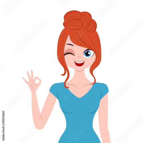 Young woman character gesturing ok sign isolated on white background