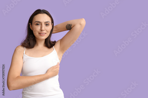 Young woman checking her breast on lilac background. Cancer awareness concept