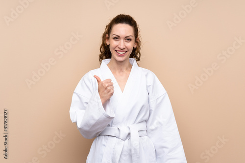 Young woman doing karate with thumbs up because something good has happened
