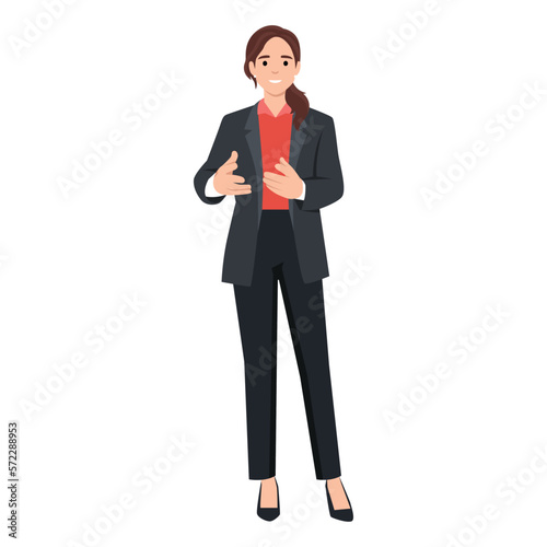 Young woman dressed in business clothes or female office workers talking to viewer. Flat vector illustration isolated on white background