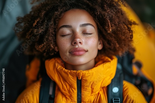 Young Woman Embracing Nature with Eyes Closed, Dressed for Winter