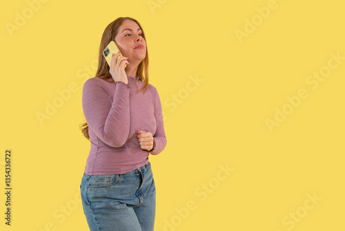 Young woman enjoying a phone conversation in vibrant yellow setting while smiling and walking with casual confidence