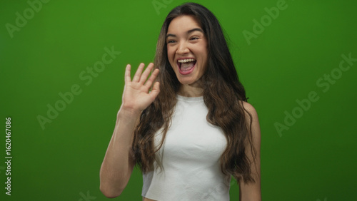 Young woman enthusiastically waves hand in studio with a wide smile and energetic pose; greeting joy.