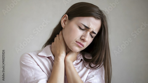 Young woman experiencing neck pain, holding her neck with a pained expression, indicating discomfort or stiffness