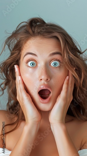 Young woman expresses surprise and excitement with wide eyes and open mouth while touching her face against a neutral background