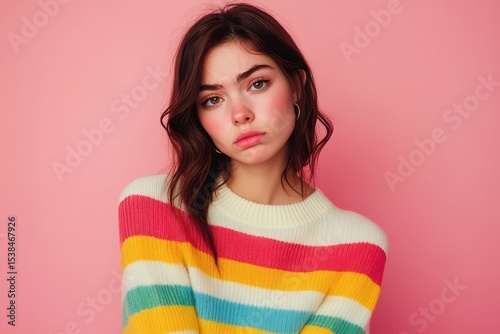 Young woman expressing sadness in colorful sweater against a pink background in a casual indoor setting during daylight hours