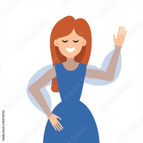Young woman greets and waves. Human interaction concept. Vector flat style illustration, isolated, white background. A girl with long hair and a smile. Positive and cartoon style