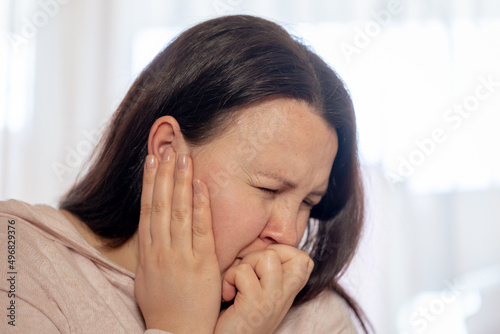 Young woman have a headache migraine stress or tinnitus - noise whistling in her ears.