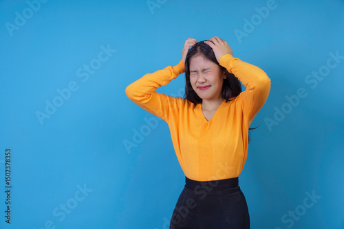 Young woman holding her head, suffering from a strong headache or stress, isolated on a blue background