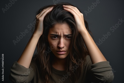 Young woman in a dimly lit room expressing exhaustion and frustration while holding her forehead, conveying deep emotion
