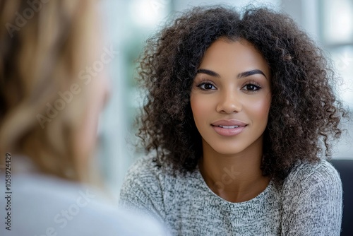 Young woman in a mental therapy session talking with a psychologist in the office, Generative AI