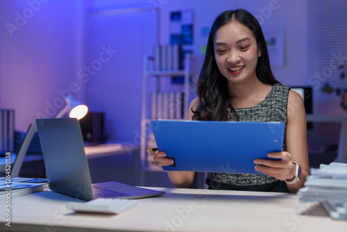 Young woman in a modern office environment works late, reviewing documents on a clipboard. The setting is illuminated by blue lighting, creating a focused and productive atmosphere