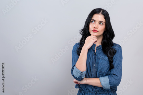 Young woman in a thoughtful pose on a gray background