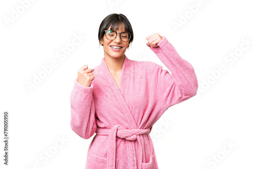 Young woman in bathrobe over isolated chroma key background celebrating a victory