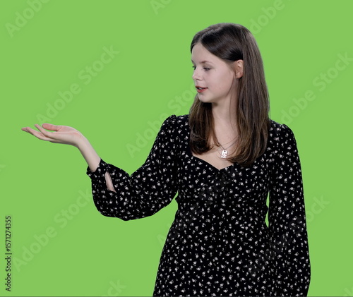 Young woman in black polka dot dress something presenting and gesturing on green chroma key background