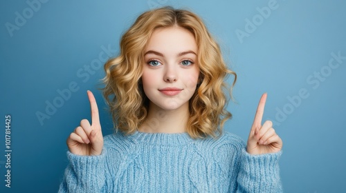 Young Woman in Blue Sweater Against Blue Background with Playful Expression, AI