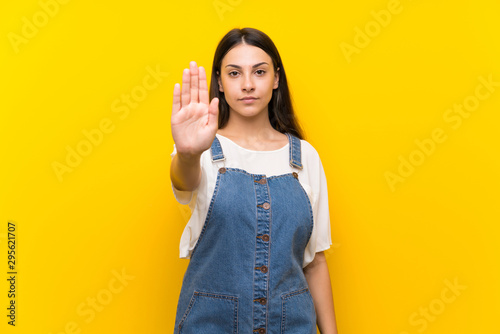 Young woman in dungarees over isolated yellow background making stop gesture
