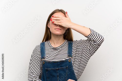 Young woman in dungarees over white wall covering eyes by hands