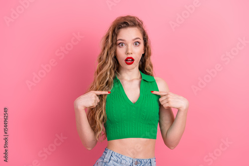 Young woman in green top with surprised expression pointing to herself against a vibrant pink background