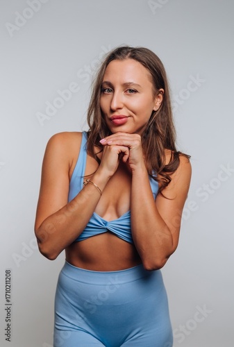 Young woman in light blue athletic wear poses confidently with a playful smile in a studio setting